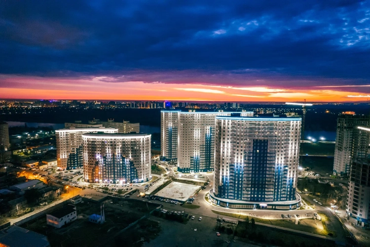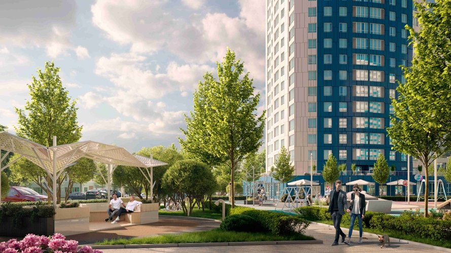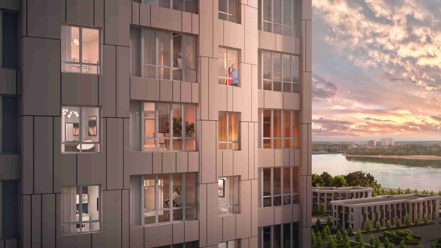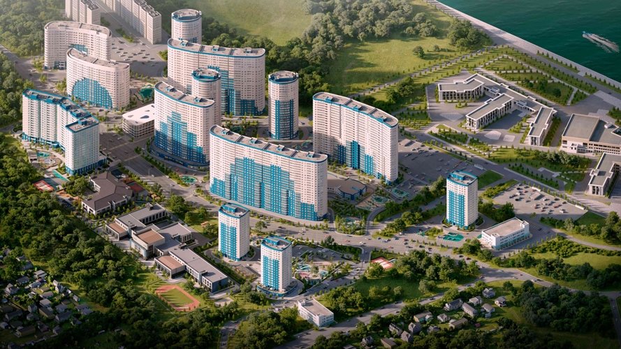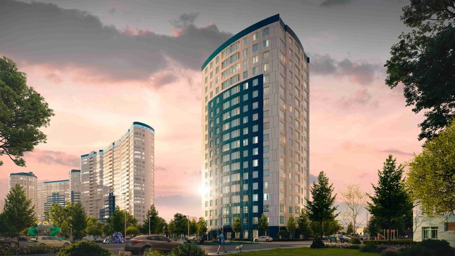 Узнаваемый почерк «Фонтанов» — дома-волны с плавными округлыми линиями. Это не просто эстетика, а продуманная инженерия: вентилируемые фасады из керамогранита в бело-голубых тонах отражают южное солнце, сохраняя прохладу в квартирах . Высота — 18-24 этажа, но благодаря скругленным балконам и панорамному остеклению здания выглядят легкими, почти парящими. Каждый корпус развернут так, чтобы максимум квартир получили виды на реку или парк.